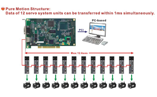 Simultaneous 3-axis linear interpolation, 2-axis arc interpolation, 3-axis helical interpolation and continuous interpolation can be implemented. DMCNET is a motion control communication network which is able to update data every 1ms and offer the ability to control 12 servo system units or 4 groups, 3-axis interpolation algorithms synchronously. It is also capable of transferring the data of 12 servo motor units, or 768 digital inputs and outputs within 1ms simultaneously.