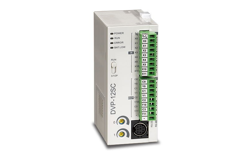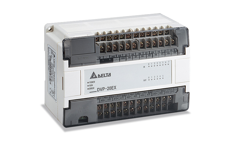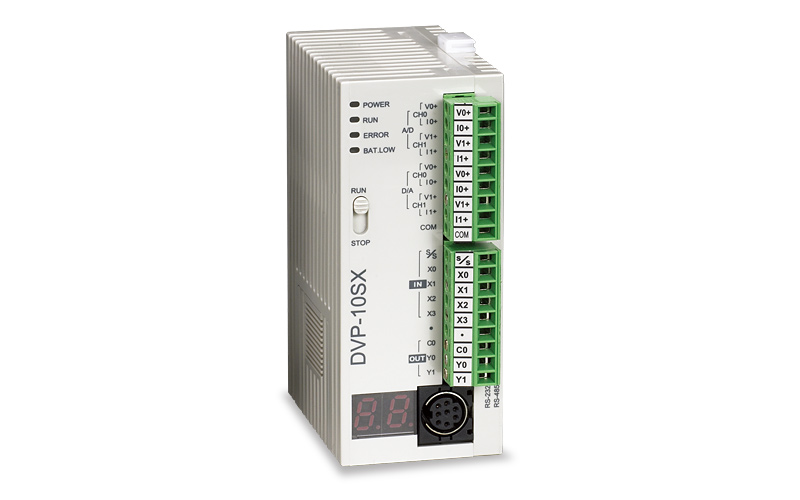 The 2nd generation DVP-SX2 series slim type PLC offers 14 digital points and built-in 12-bit analog I/O points.
