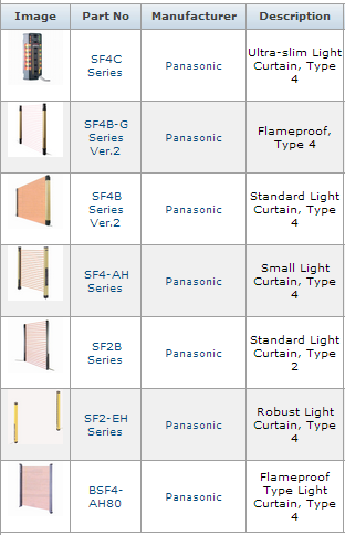 Safety light curtains by Panasonic offer up to category 4 protection and are suitable for all you machine safeguarding needs. Offering units with no dead zone detection and built-in muting and blanking functions, we can provide you with a solution that is tailored to the needs of your machine. Explore the models listed below to find the best light curtain for your needs.